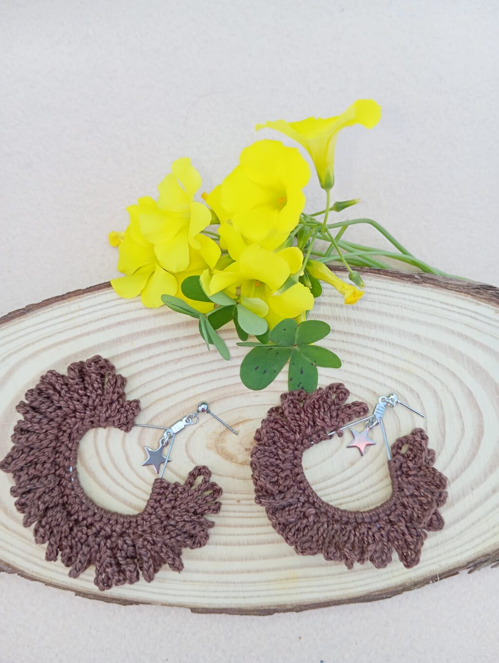 Holita pendientes en forma de flor con pétalos medianos todo hecho a mano en crochet con pendiente en acero dorado en forma también de flor muy bonitos no pesan nada son muy ligeros en diferentes colores para dar un poco de color y combinar con nuestra ropa. Este color marrón chocolate es el color de…