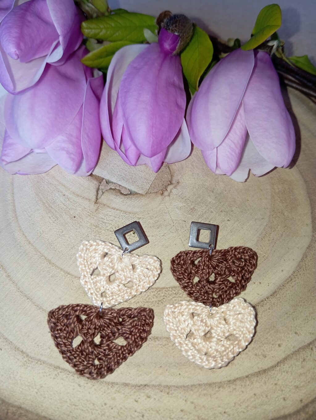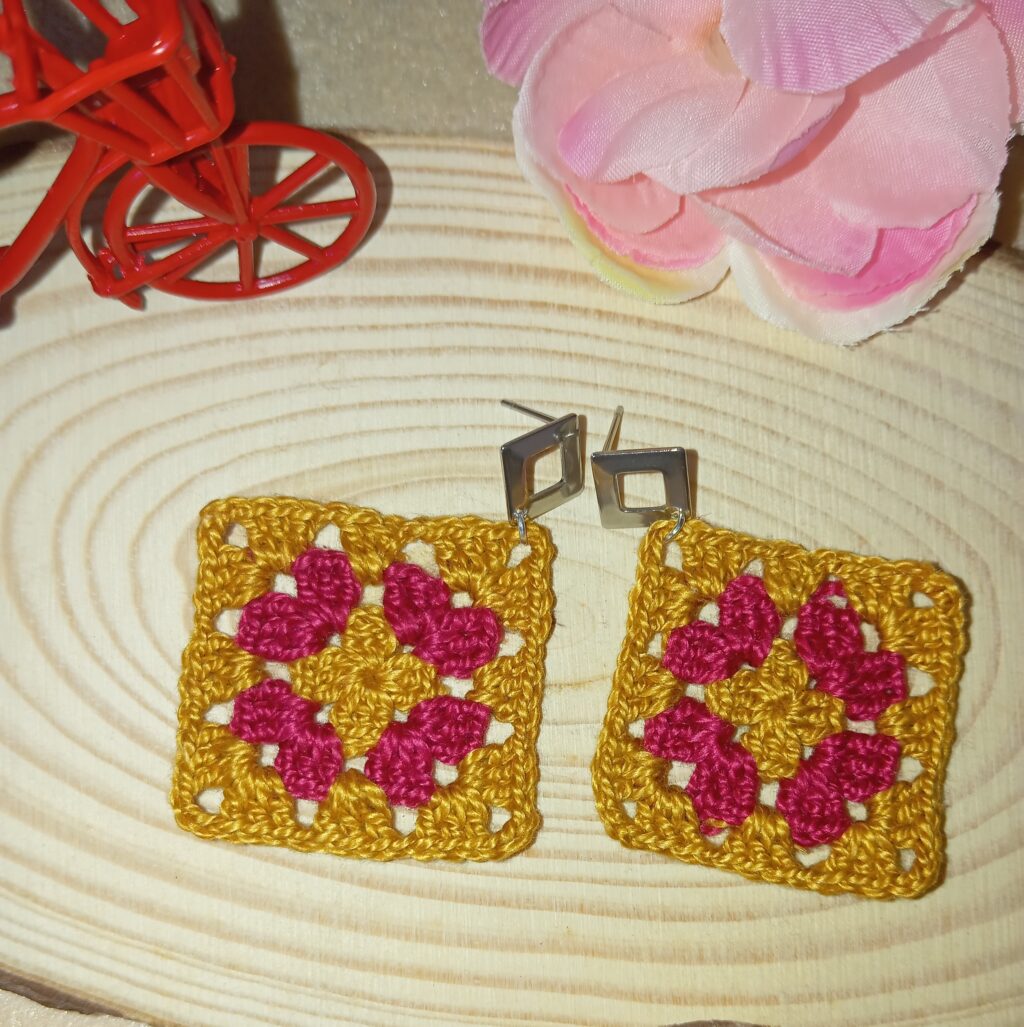 Holita que pendientes más bonitos en forma de grannys squares de colores muy de moda esta primavera dorado y granate son pequeños muy cómodos de llevar no pesan nada, el pendiente es de acero plateado. Un saludo desde Esmarcrochet.