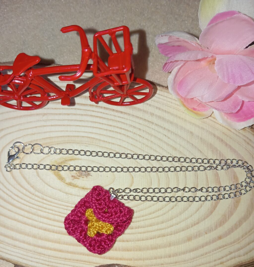 Holita tenemos unas cadenas en acero plateado con colgante en forma de sobre de granny squares en color granate y dorado muy original. Para dar color a nuestros looks de esta primavera. Un saludo desde Esmarcrochet.