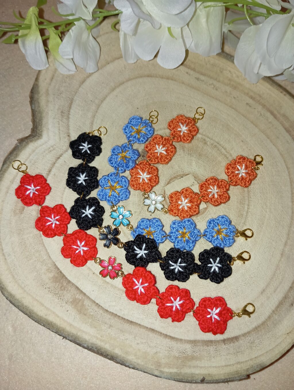Holita un conjunto muy bonito que consiste en una pulsera de pequeñas flores y un colgante también con dos flores de adorno. En muchos colores para que disfruten nuestras peques poniendo color a sus looks. Todo en acero y crochet. Un saludo esmarcrochet.