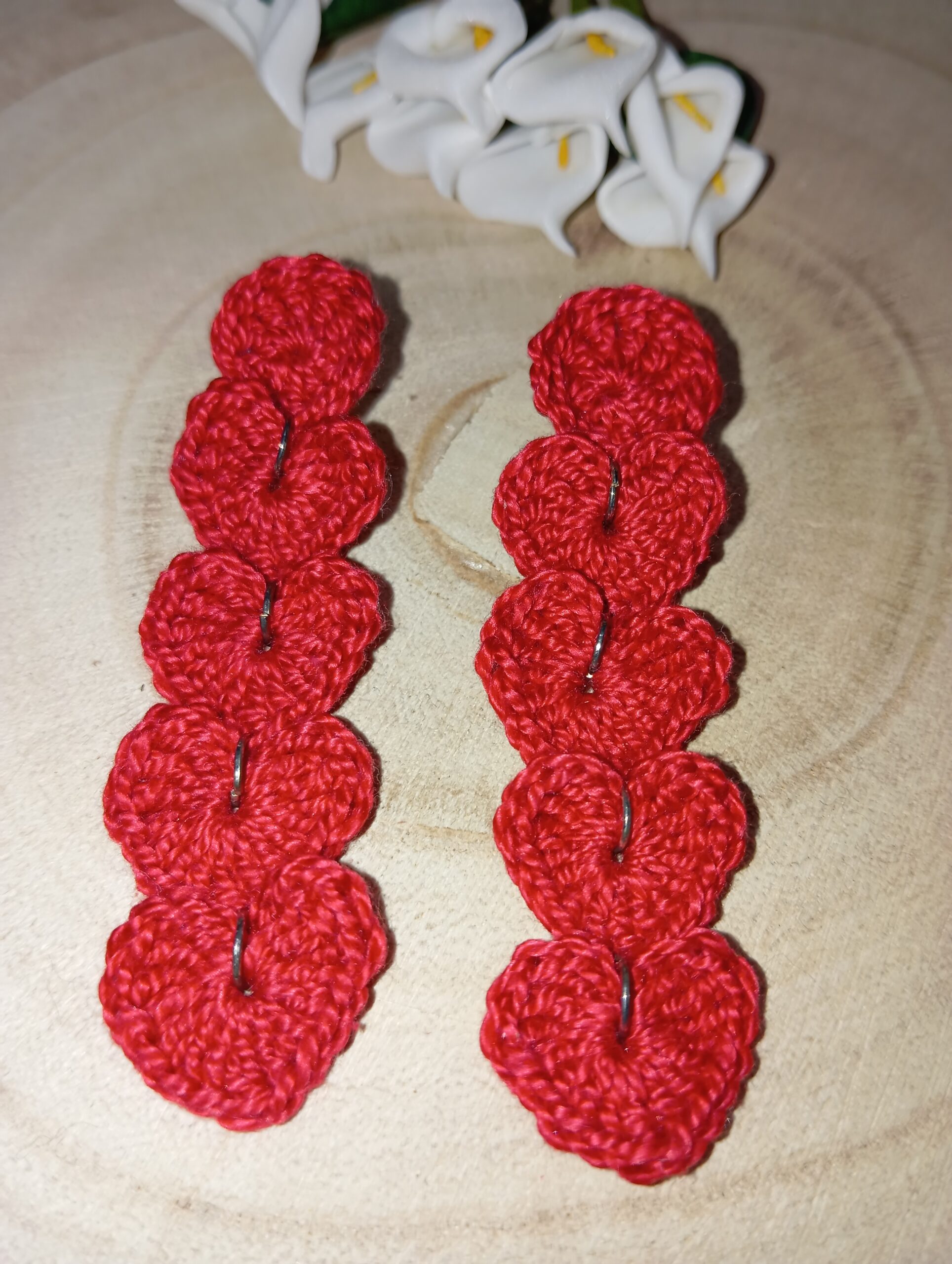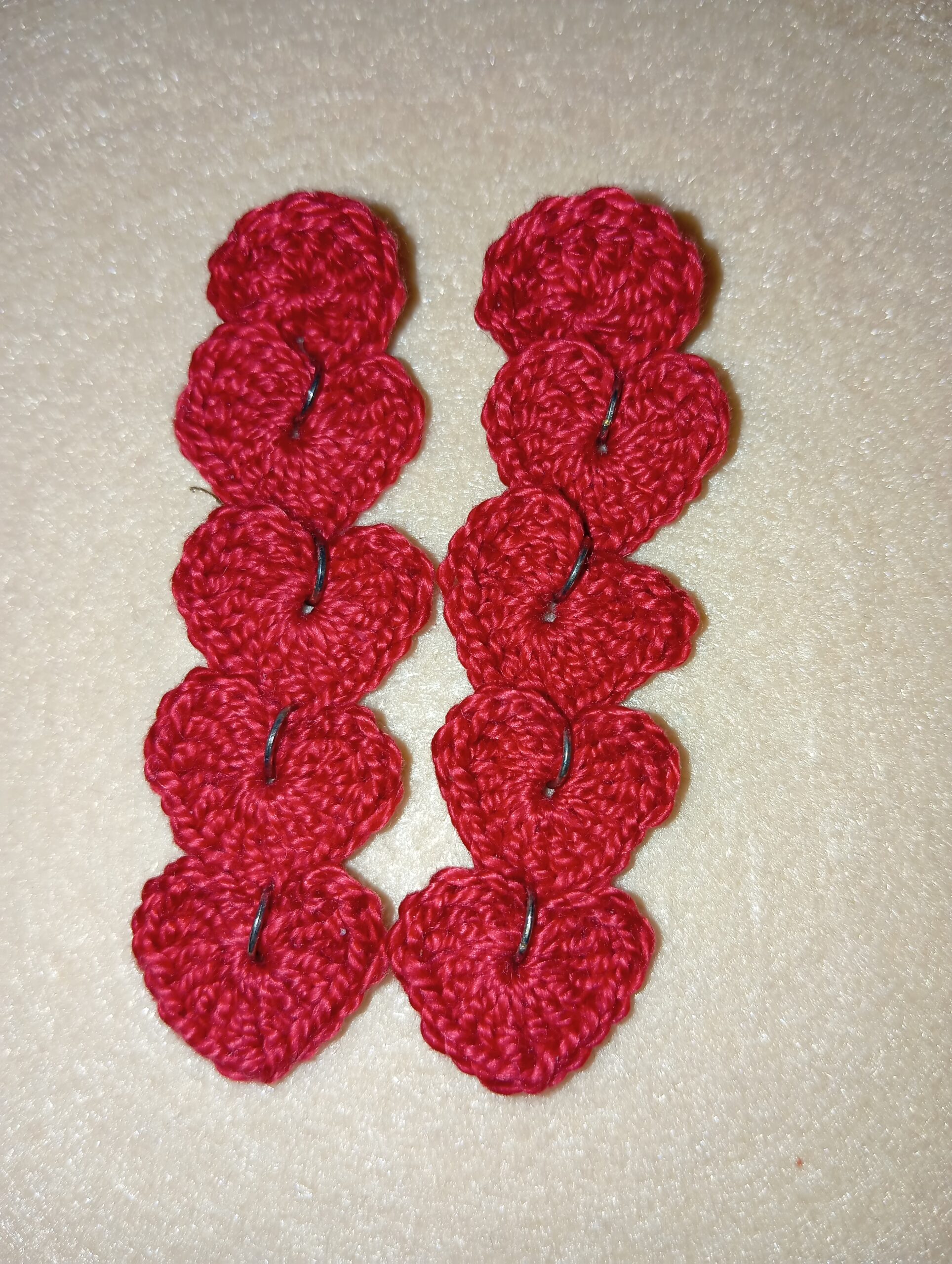 Pendientes de corazones color granate a crochet hechos a mano.