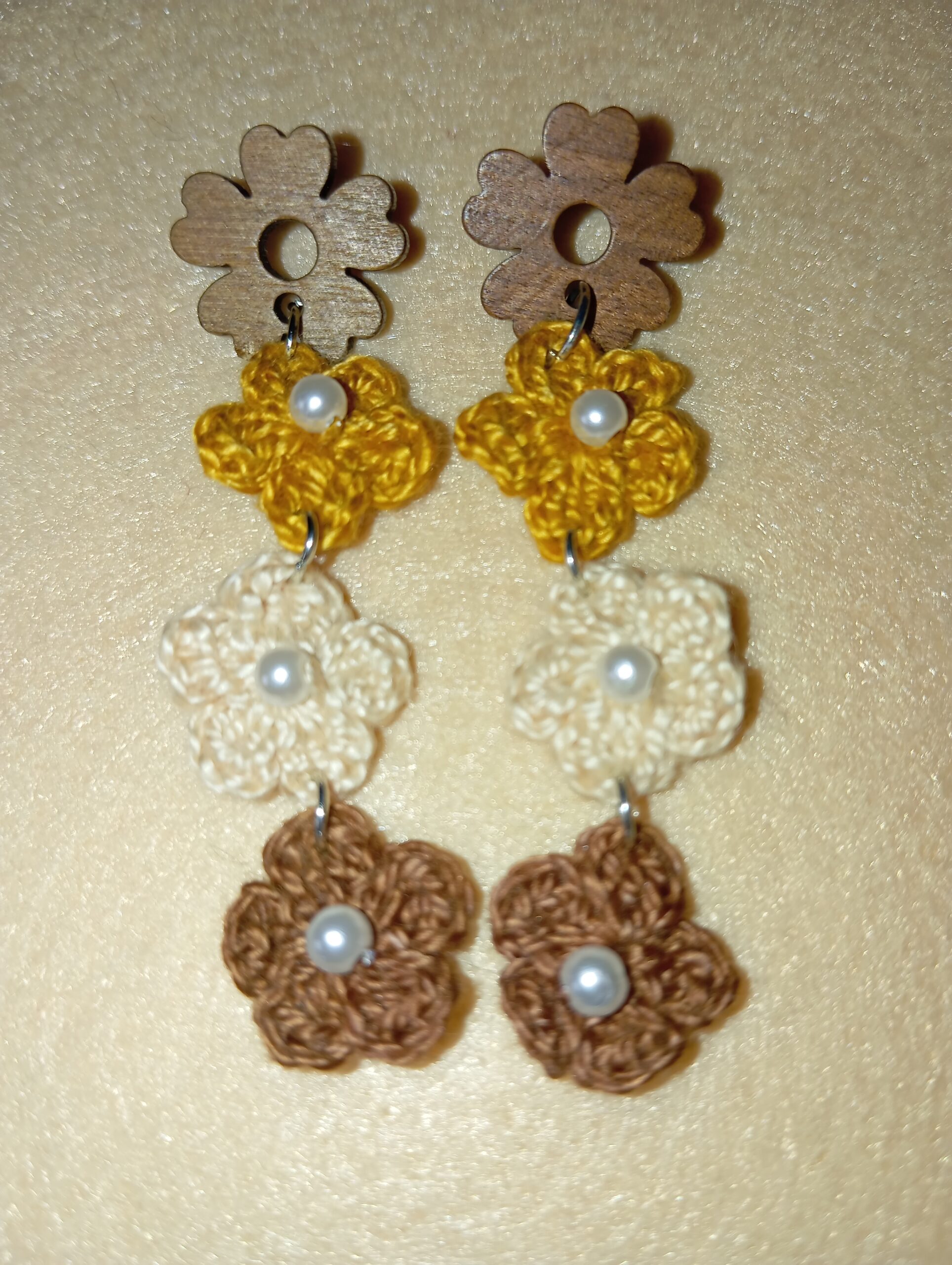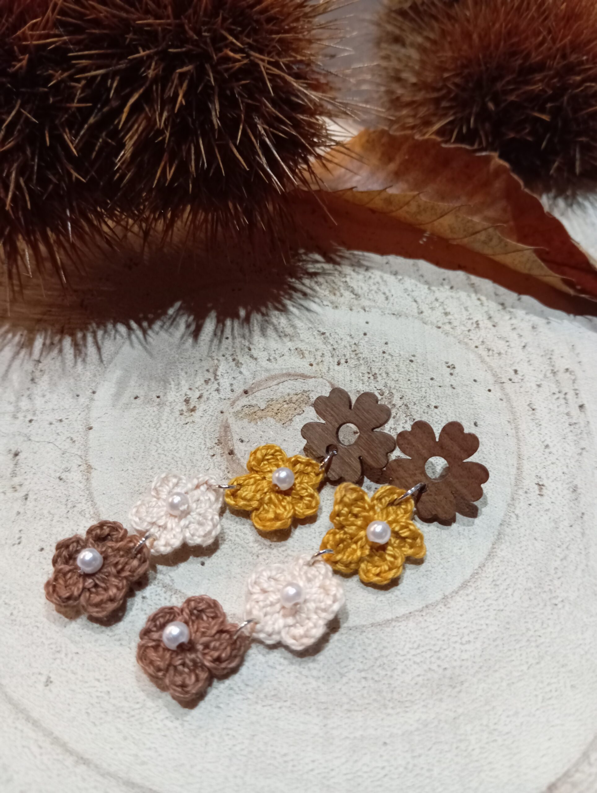 Pendientes de madera y flores a crochet color marrón