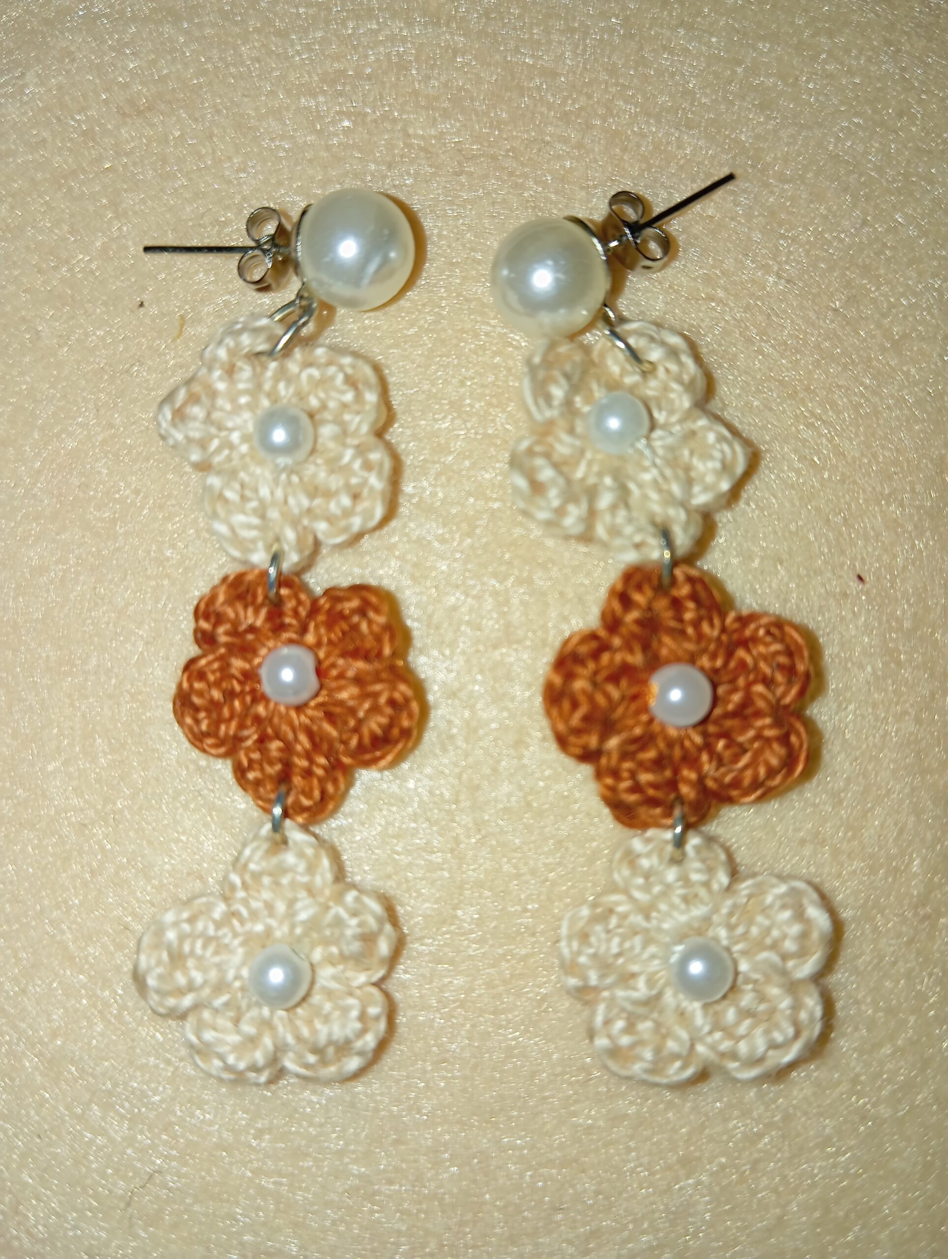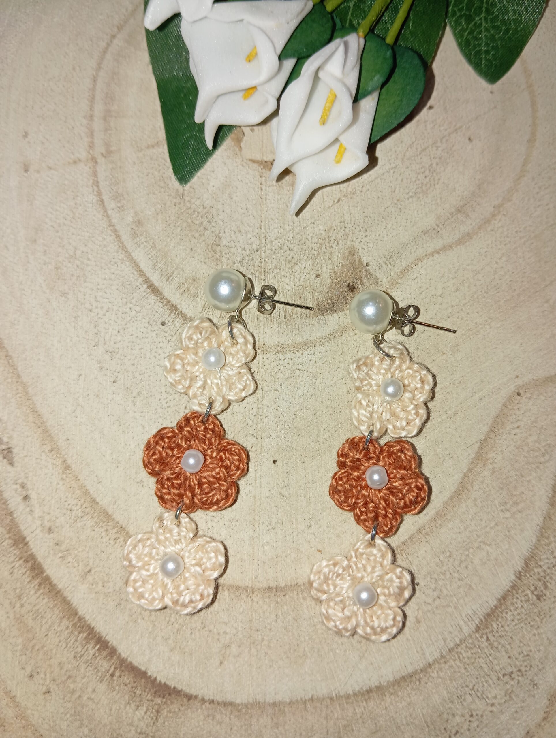 Pendientes de perlas en acero inoxidable con flores en crochet de color beige y marrón chocolate.