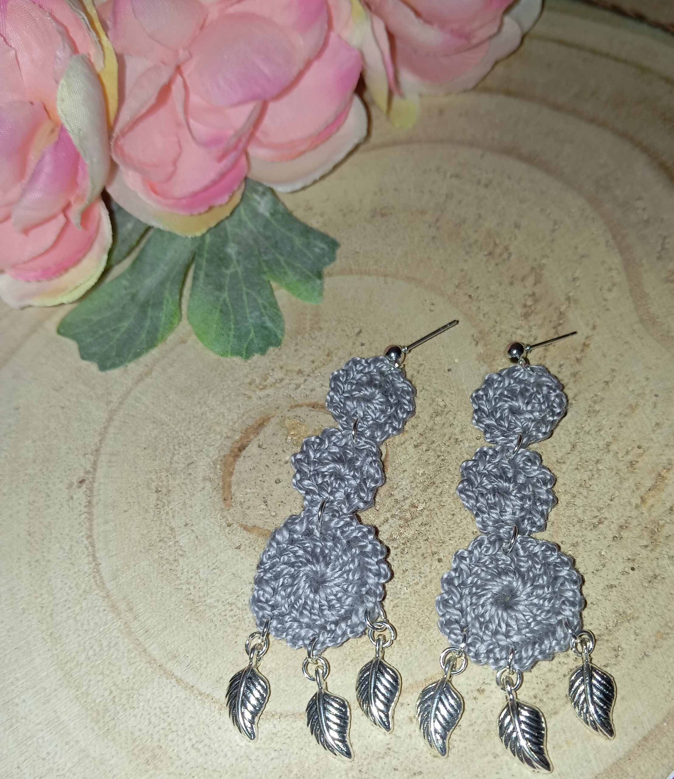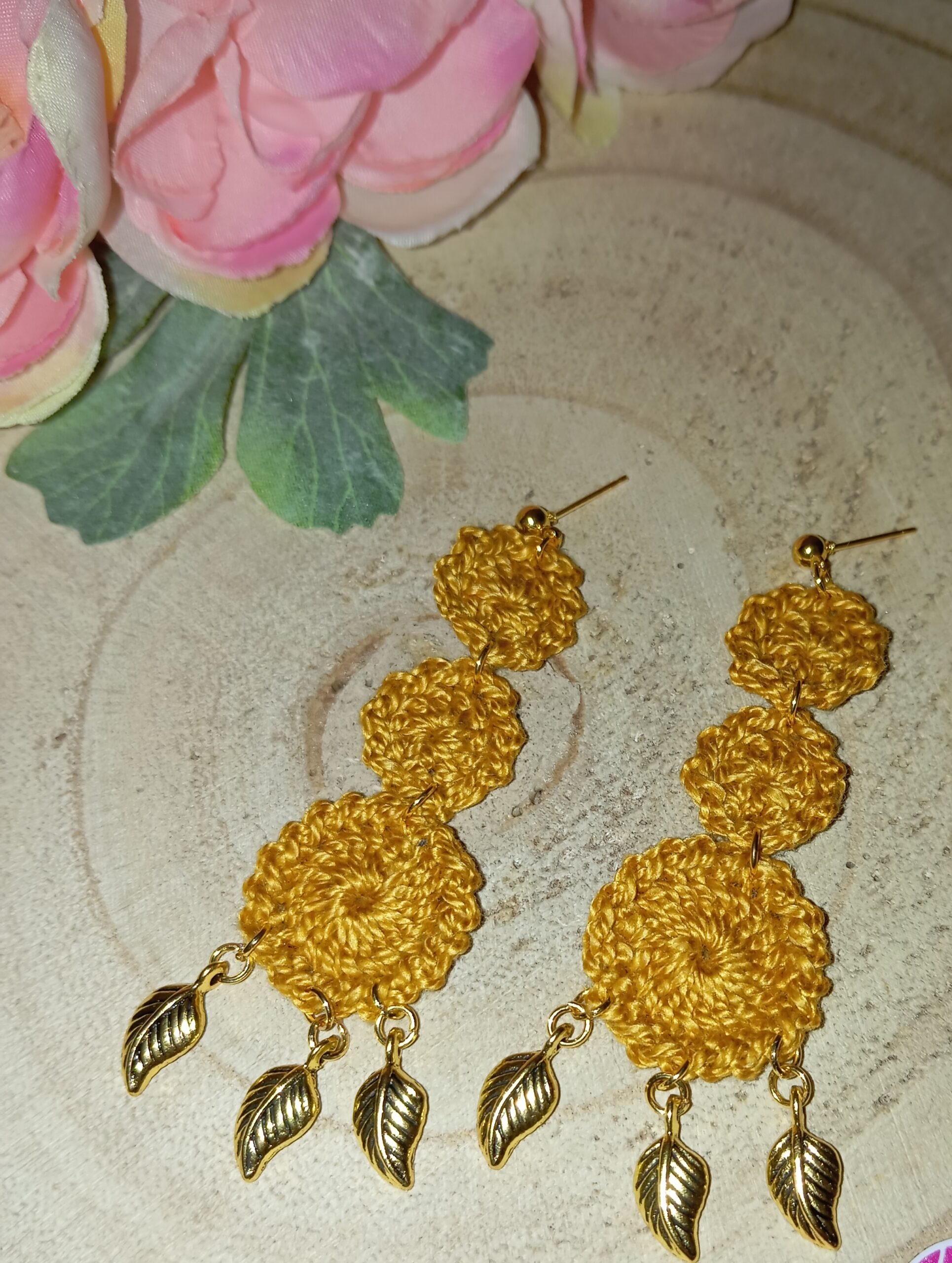 Pendientes de acero dorado y plateado con circulos hechos en crochet adornos de plumas de acero.