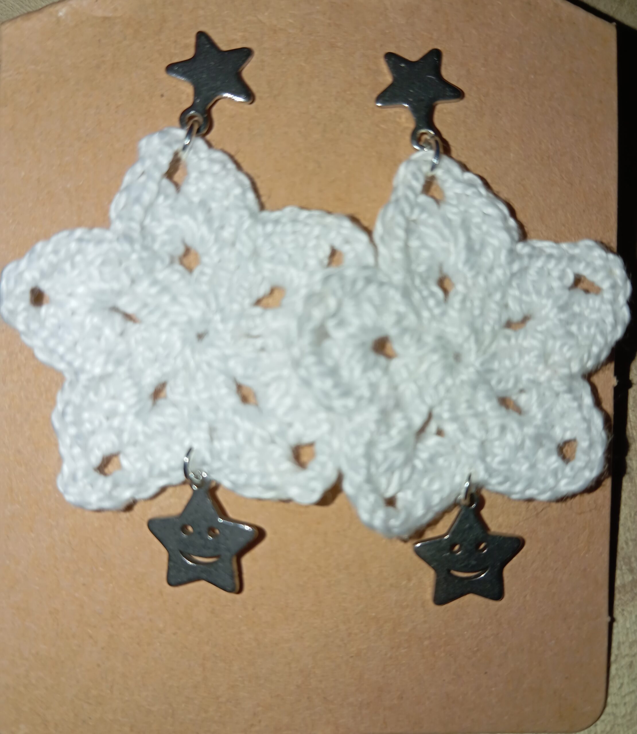 Pendientes en forma de estrella a crochet y colgante de estrella sonriente en acero.