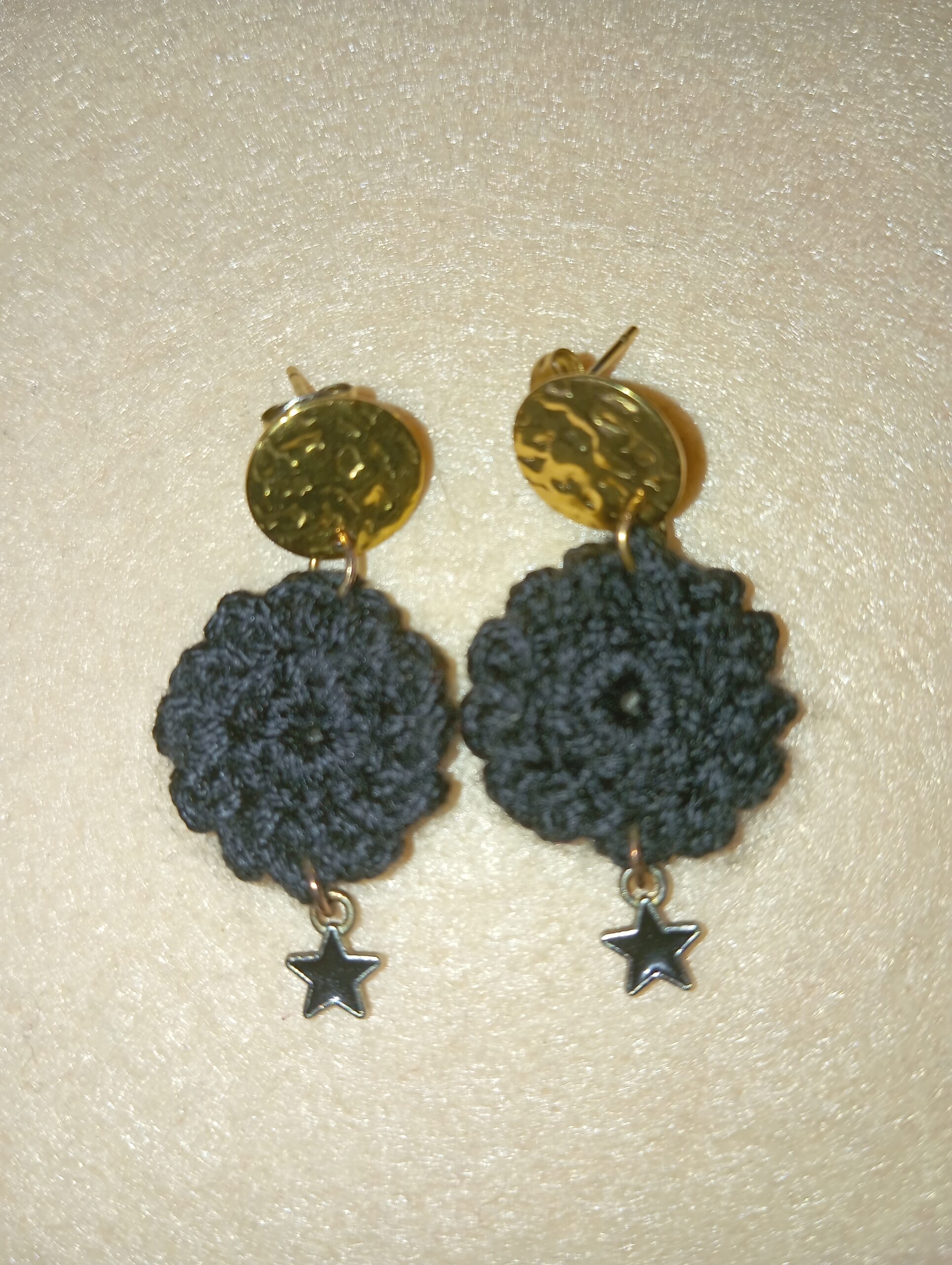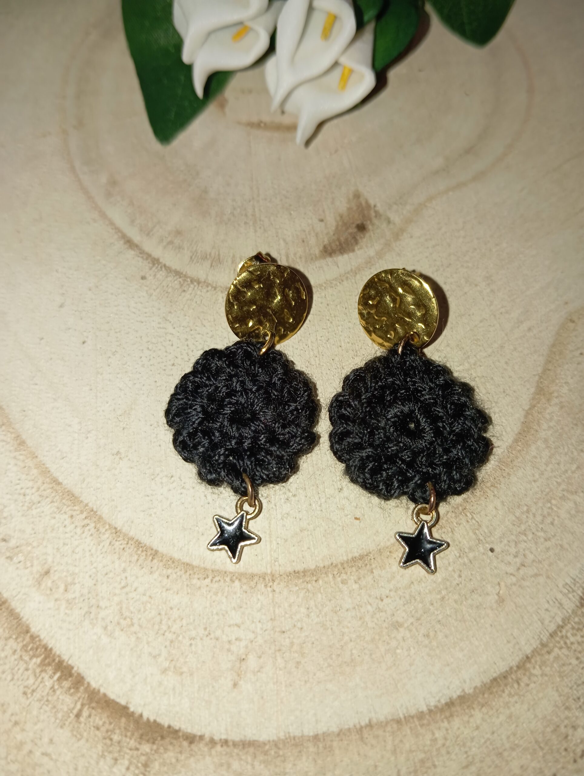 Pendientes en acero inoxidable dorado y bolita a crochet en color negro con adorno de estrellitas.