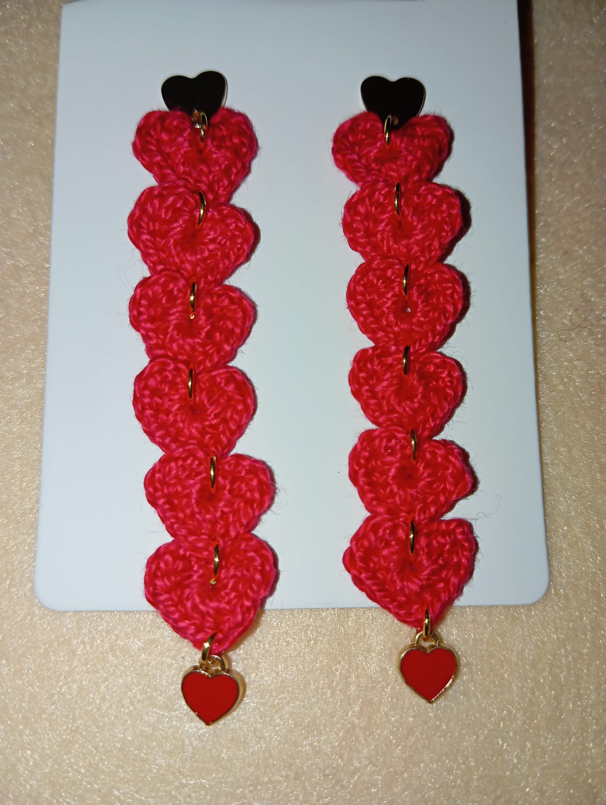 Pendientes de «San Valentín» corazones en crochet rojos y colgantes en acero dorado.